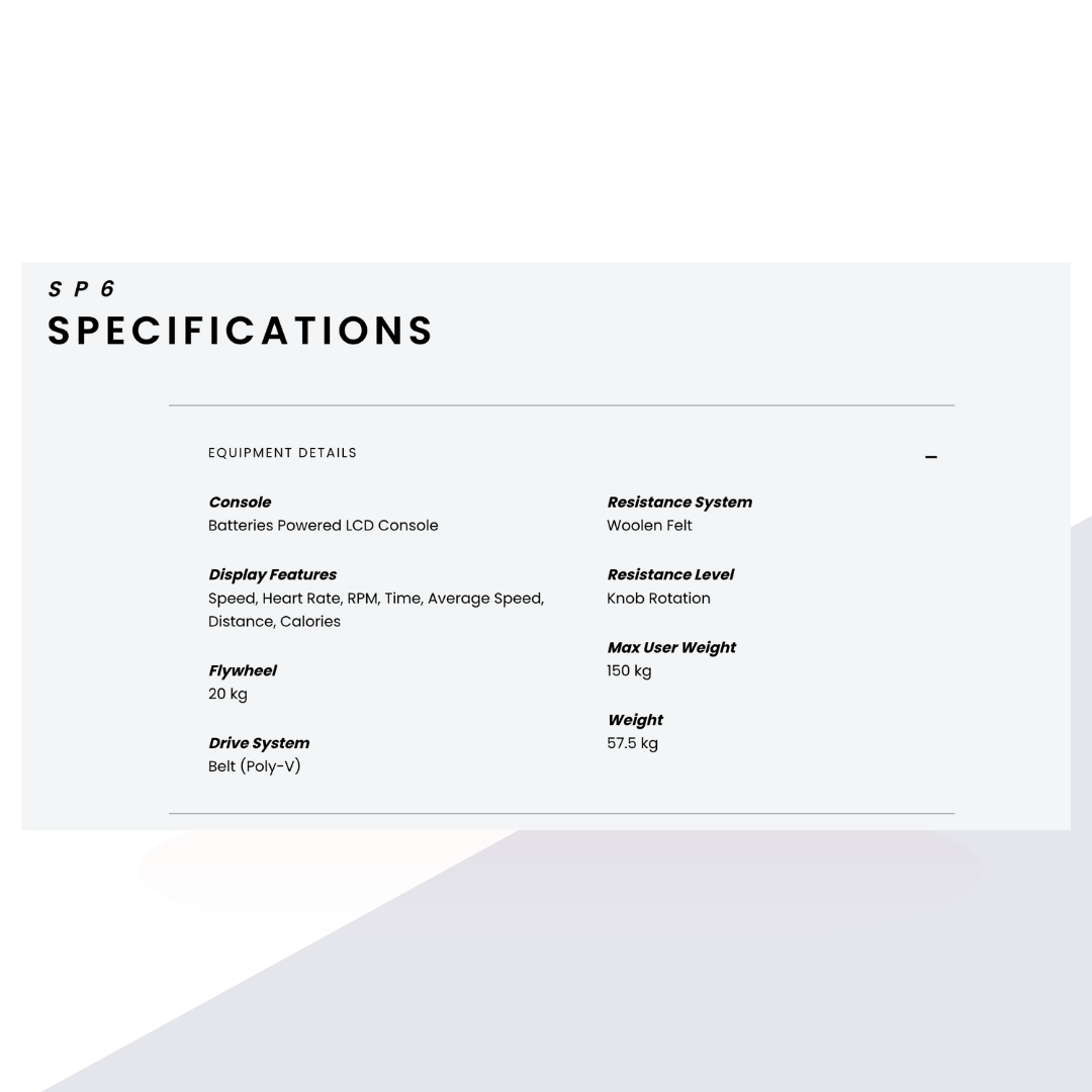 Designed for home and light‑commercial use, the Circle Fitness SP6 indoor cycle features a heavy 20 kg flywheel paired with a poly‑V belt drive for a smooth, quiet ride. Its woolen felt friction brake system provides precise resistance control via a rotation knob, and the race‑inspired handlebar with multiple grip positions plus fore‑and‑aft adjustable saddle ensure comfort. The bike’s steel frame is durable and supports users up to 130 kg【425329767168922†L7-L50】.