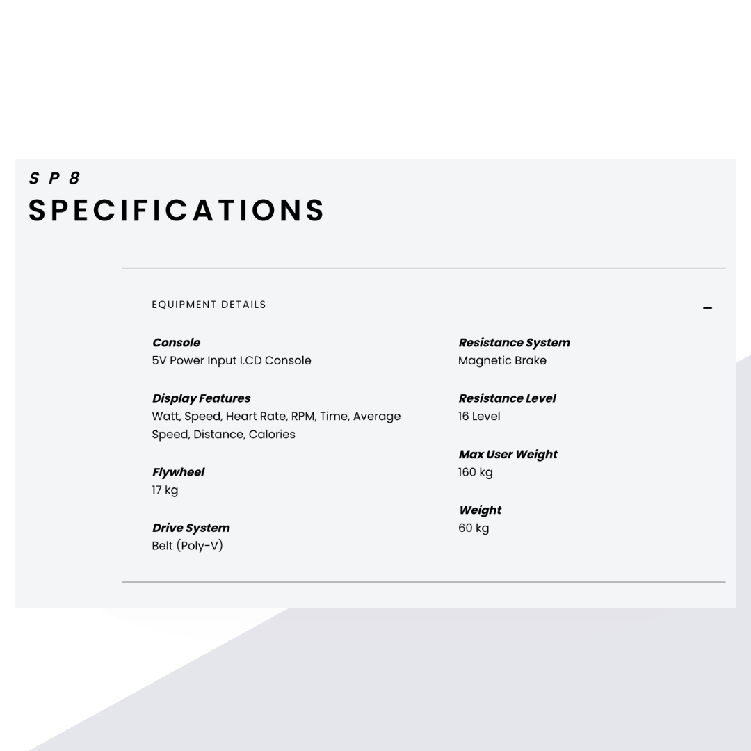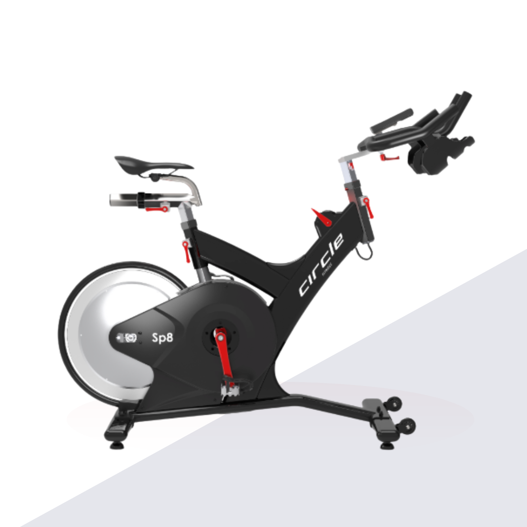 The Circle Fitness SP8 spin bike features a fore‑and‑aft adjustable handlebar with multi‑position grips, an aluminium‑alloy 33 lb flywheel and a durable poly‑V belt drive for quiet, smooth operation. SPD dual pedals, a 19‑level adjustable saddle and rear flywheel design ensure a comfortable and customisable ride. Its magnetic resistance system offers 16 levels of challenge, while the steel frame has been treated with an anti‑rust powder coat. Suitable for users up to 158.75 kg, the compact 140 × 65 cm footprint makes it ideal for both home and commercial gyms【992608271580047†L16-L99】.